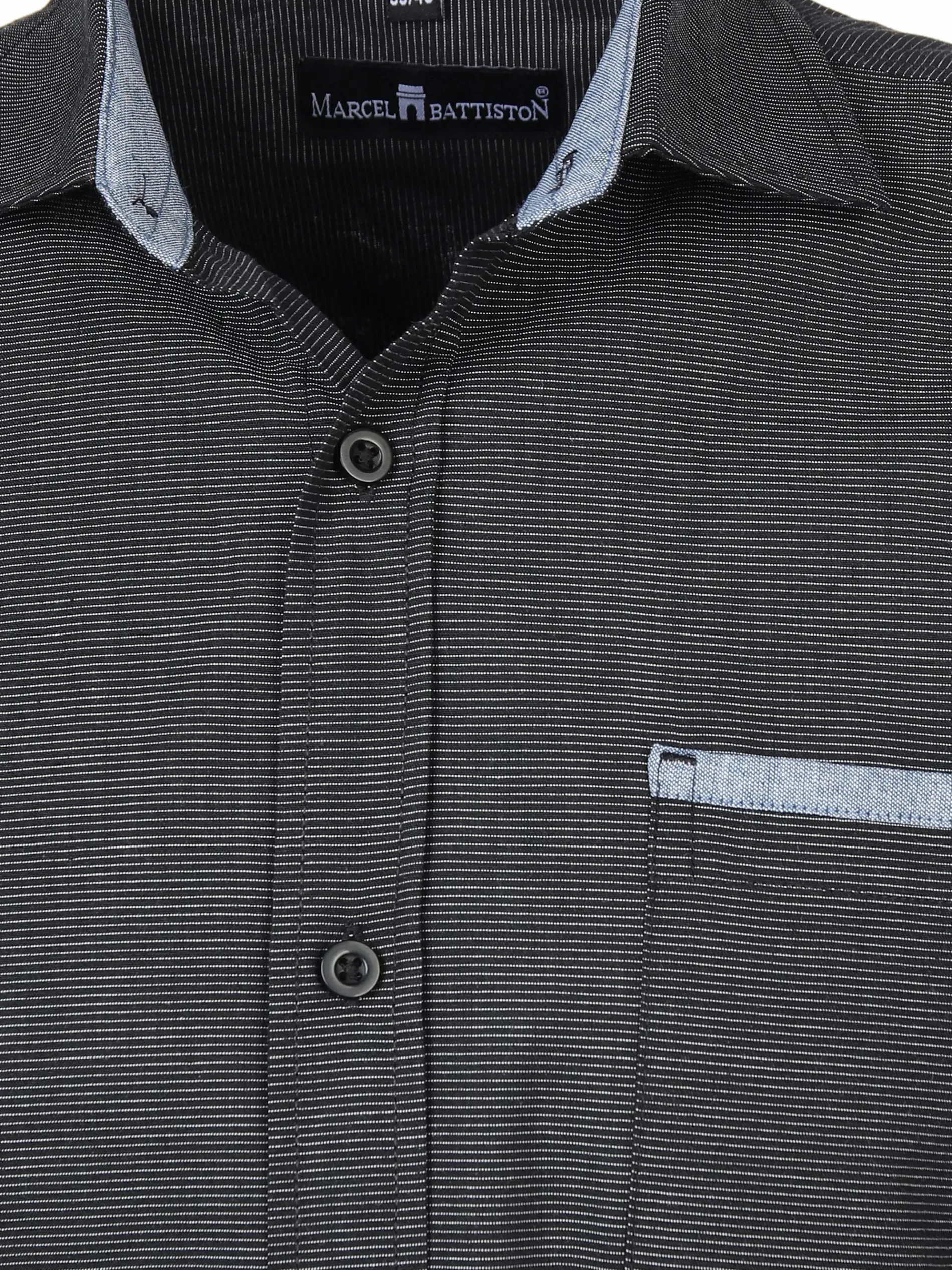 - klassischer Kentkragen und aufgesetzte Brusttasche mit abgesetzter Paspelumrandung