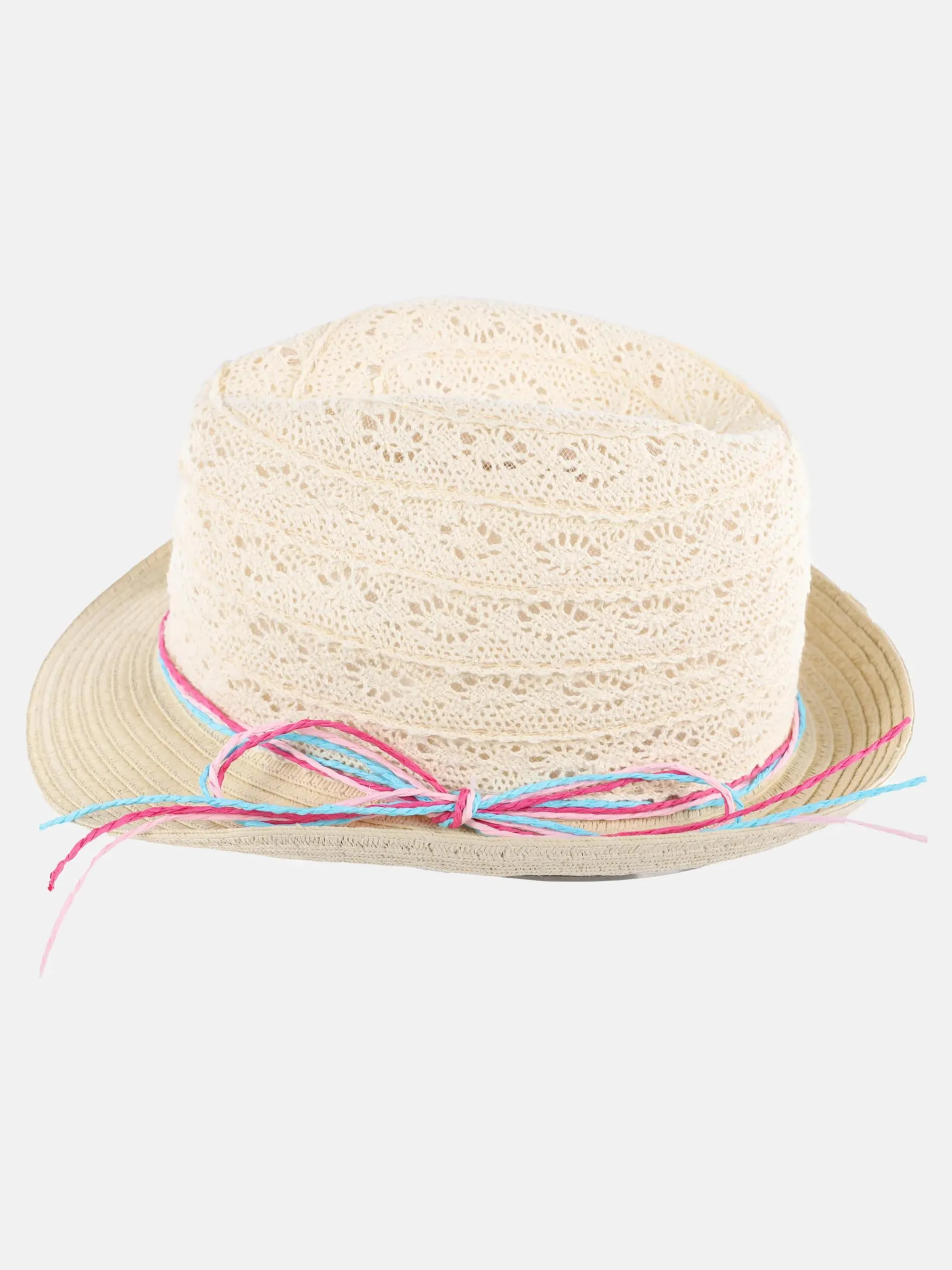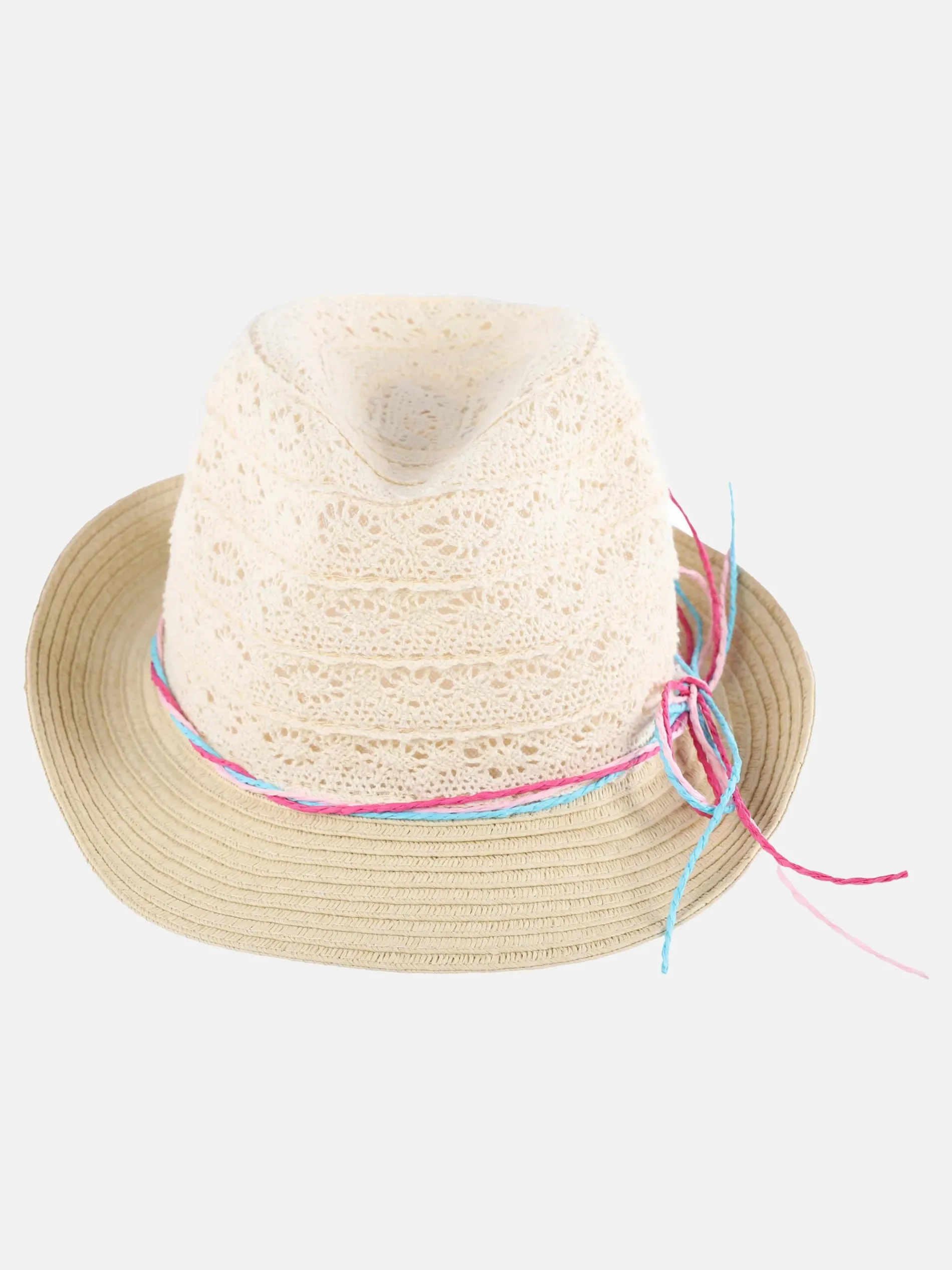 - umlaufende, bunte Bastkordel als Hutband