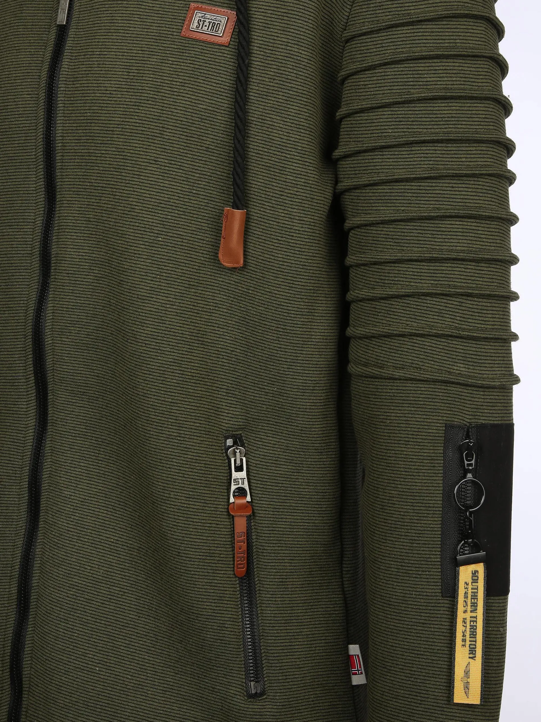 - Tasche am linken Oberarm und langem Zipper
